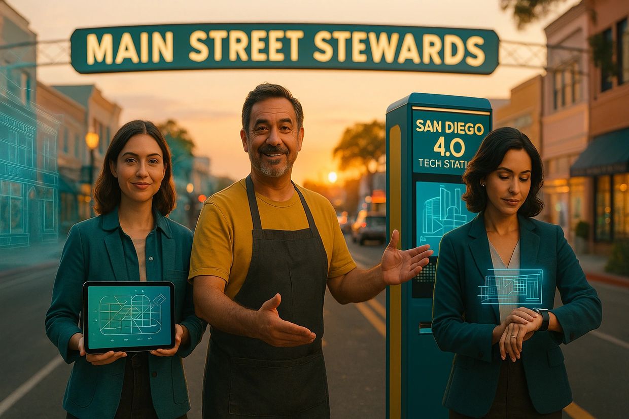 When Ava visits a San Diego 4.0 Tech Station, she’s drawn not by the technology itself, but by its purpose. She interacts with Breezy, Luz, and Echo because they help her see what’s behind the screen — the people, history, and values that built a community. She’s naturally curious, scanning AR overlays and VR previews to learn how the past shaped today’s Main Streets.